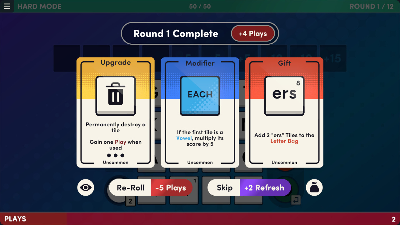 Чтобы побеждать в Word Play, важно находить баланс между богатым словарным запасом и эффективным управлением ресурсами, особенно когда требования к очкам постоянно растут. Набрав достаточно баллов для завершения этапа, игрок получает на выбор усиление, которое поможет в дальнейшем прохождении. Эти бонусы делятся на три категории, каждая из которых меняет игровой процесс. Модификаторы могут перекраивать базовые правила, создавая новые условия для подсчета очков и формирования слов.