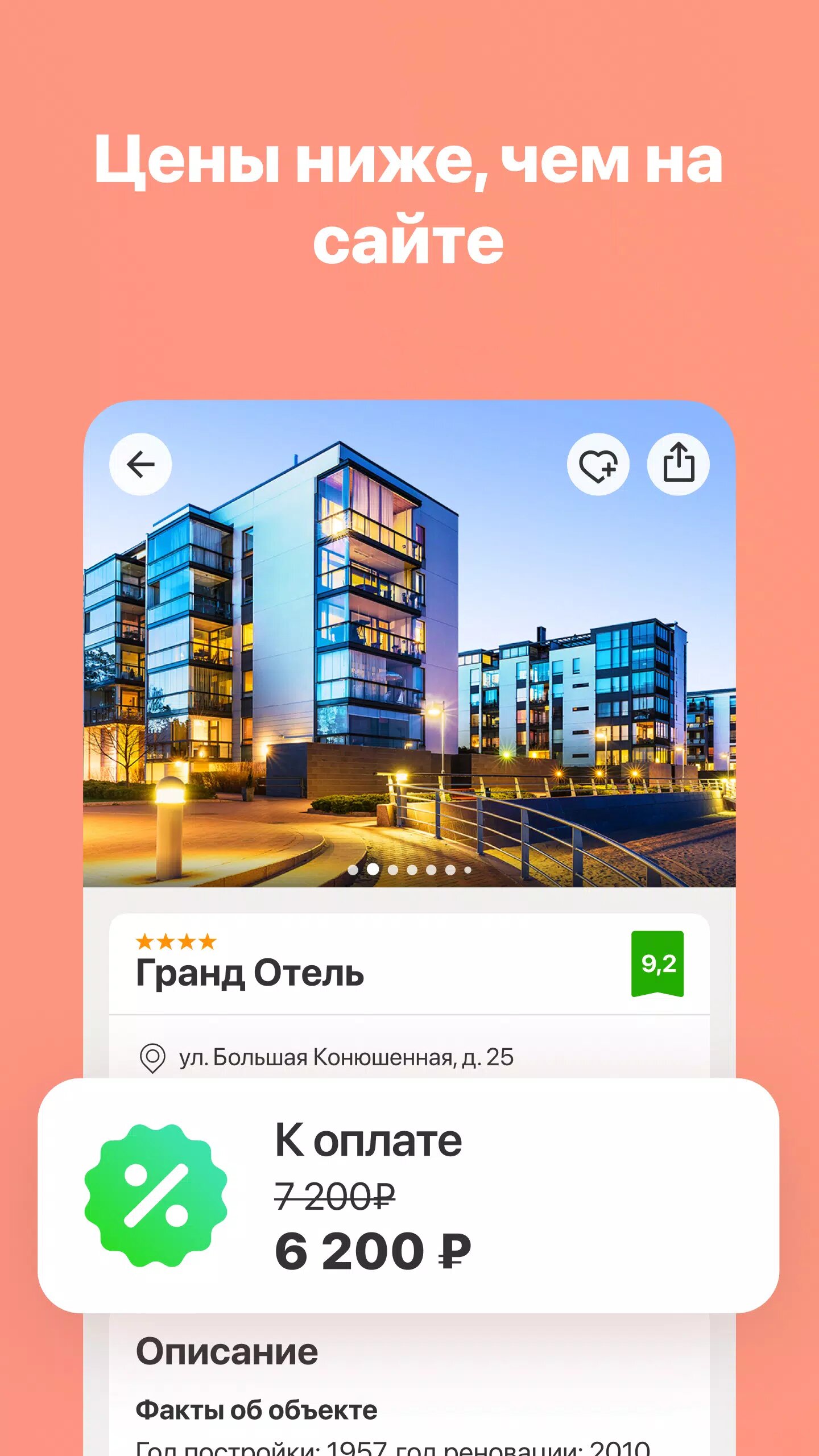 - Гибкий поиск: находите отели по заданному направлению или просматривайте варианты рядом с вашим текущим местоположением.